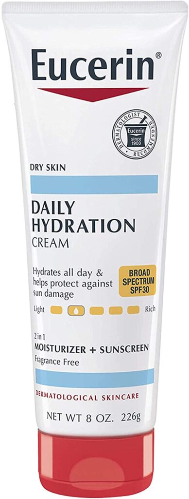 Since I suffer from dry skin, I’ve been using TEucerin Daily Hydration Broad Spectrum SPF 30 Sunscreen Body Cream. My skin gets deep hydration without the usual aftereffects of greasiness or heaviness. It also has a broad spectrum SPF, which gives me peace of mind when spending time outside. However, I have noticed that it can leave a slight white cast on my skin if I don’t apply it evenly. Overall, I would recommend this moisturizer to anyone with dry skin looking for a daily moisturizer with sun protection.